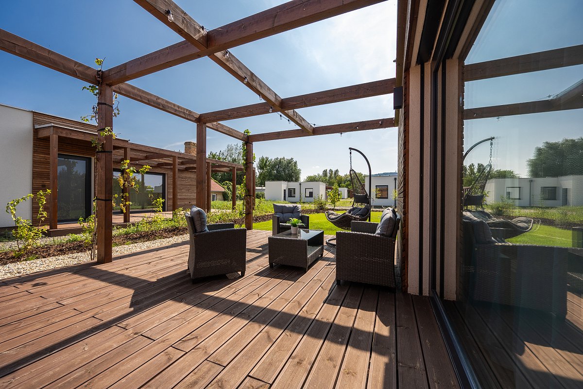 Domy a apartmány jsou dopravně napojeny na příčnou komunikaci. Dům má dvě parkovací místa a apartmány pro každou jednotku jedno parkovací místo. Samotný rekreační dům je jednopodlažní, půdorysně tvoří písmeno “L“, dům s aparmány je také jednopodlažní orientovaný na severní a jižní stranu. Na pozemku jsou domy umístěny zrcadlově.