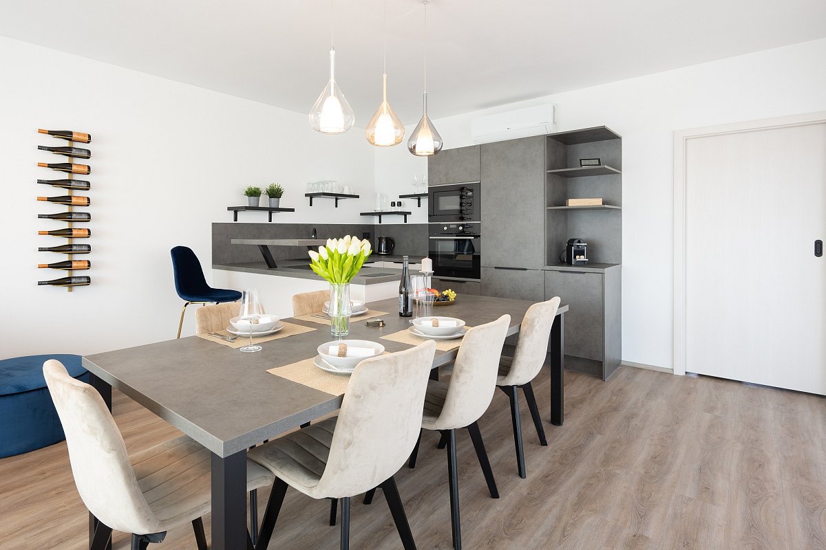 Apartmán má dispozici 2+kk. Vstoupíte bočním vstupem přes část soukromé terasy. V předsíni je velkorysá vestavná šatní skříň. Navazuje vnitřní chodba se vstupy do ložnice a do rozlehlé obývací části s kuchyňským koutem a krásným výhledem. Terasa je s interiérem propojena HS portálem. Koupelna je nadstandardně řešena, se sprchovým walk-in koutem a WC. Dále je zde technické zázemí se zásobníkem teplé vody a prostorem pro pračku a sušičku.